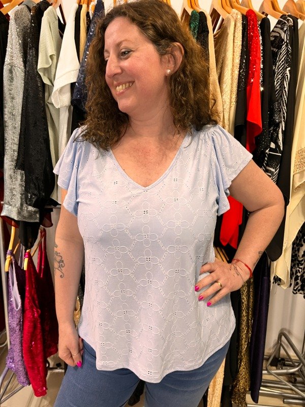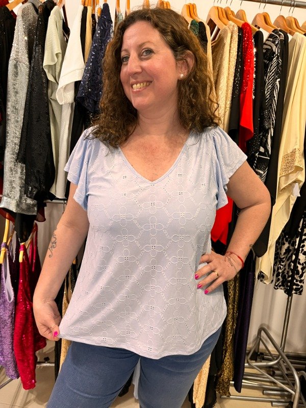 Remeras Broderie Cuello en V Elastizadas Evase - Abarca L-XL Celeste