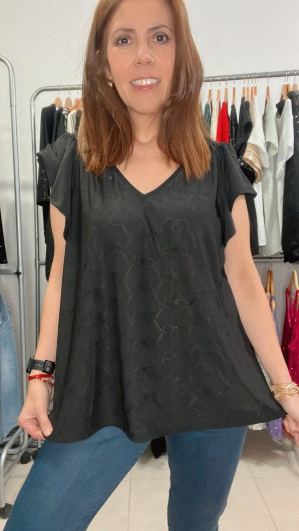 Remeras Broderie Cuello en V Elastizadas Evase - Abarca L-XL Negro