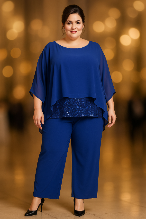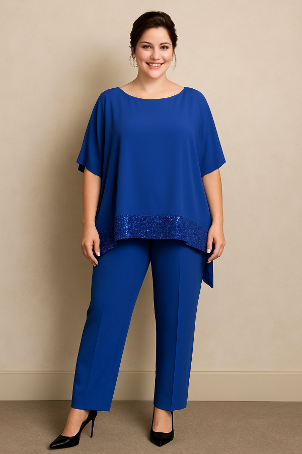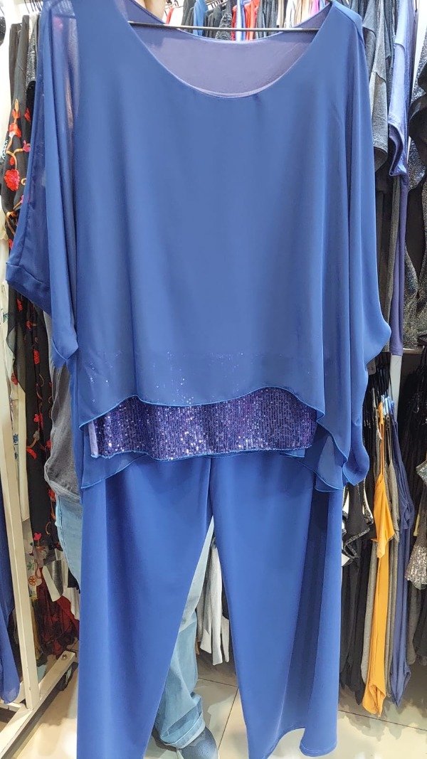 Pantalon Palazzo Seda Fria hermosa caida y cintura super elastizada + Blusa de Gasa Lentejuelas Azules